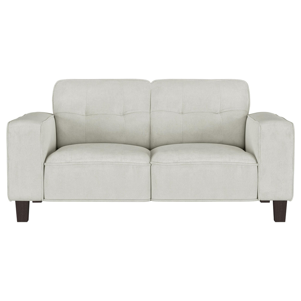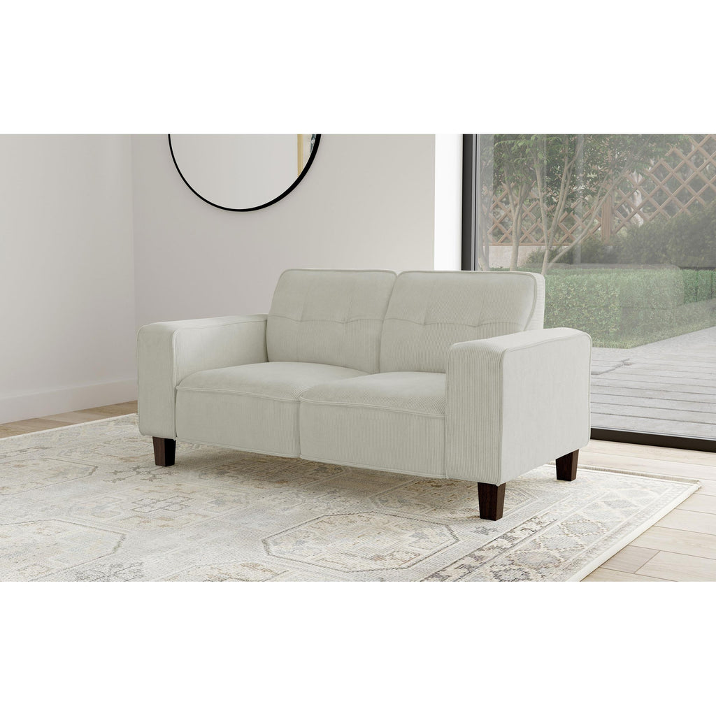 • A modern loveseat offers inviting flair with soft upholstery in a lovely neutral hue