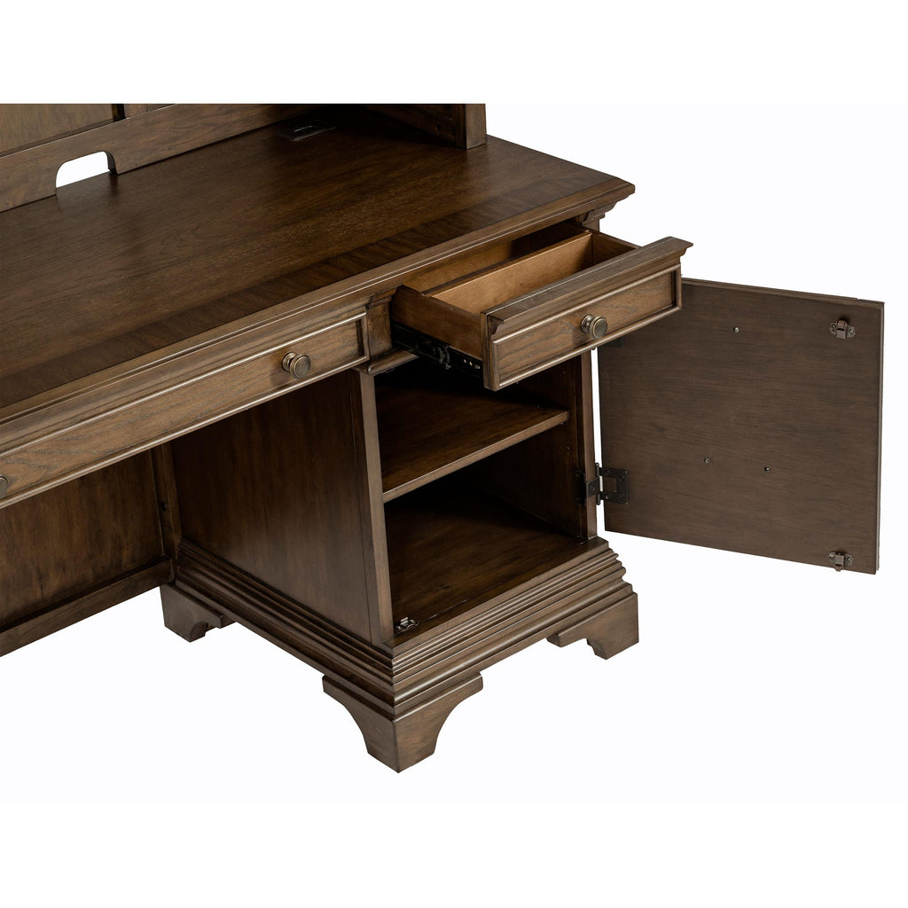 • Credenza includes a power outlet (2AC/2USB), center keyboard drawer, two top drawers and middle drawer with removable dividers, one lockable file cabinet, and a cabinet with an adjustable shelf