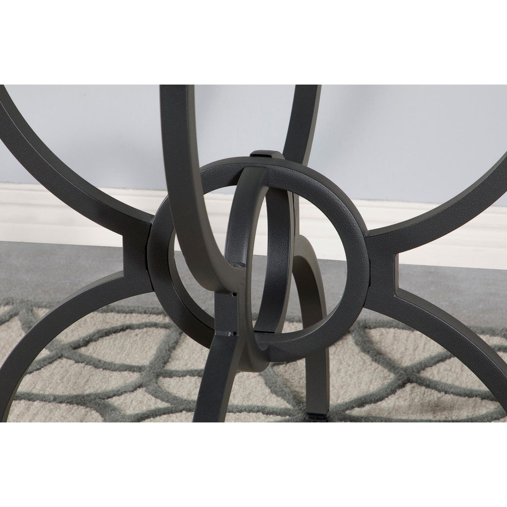 • Transitional charm meets sophistication: a clear glass round gracefully rests on a captivating metal base with stylized M legs interlocked in a ring motif, finished with rich gunmetal sheen