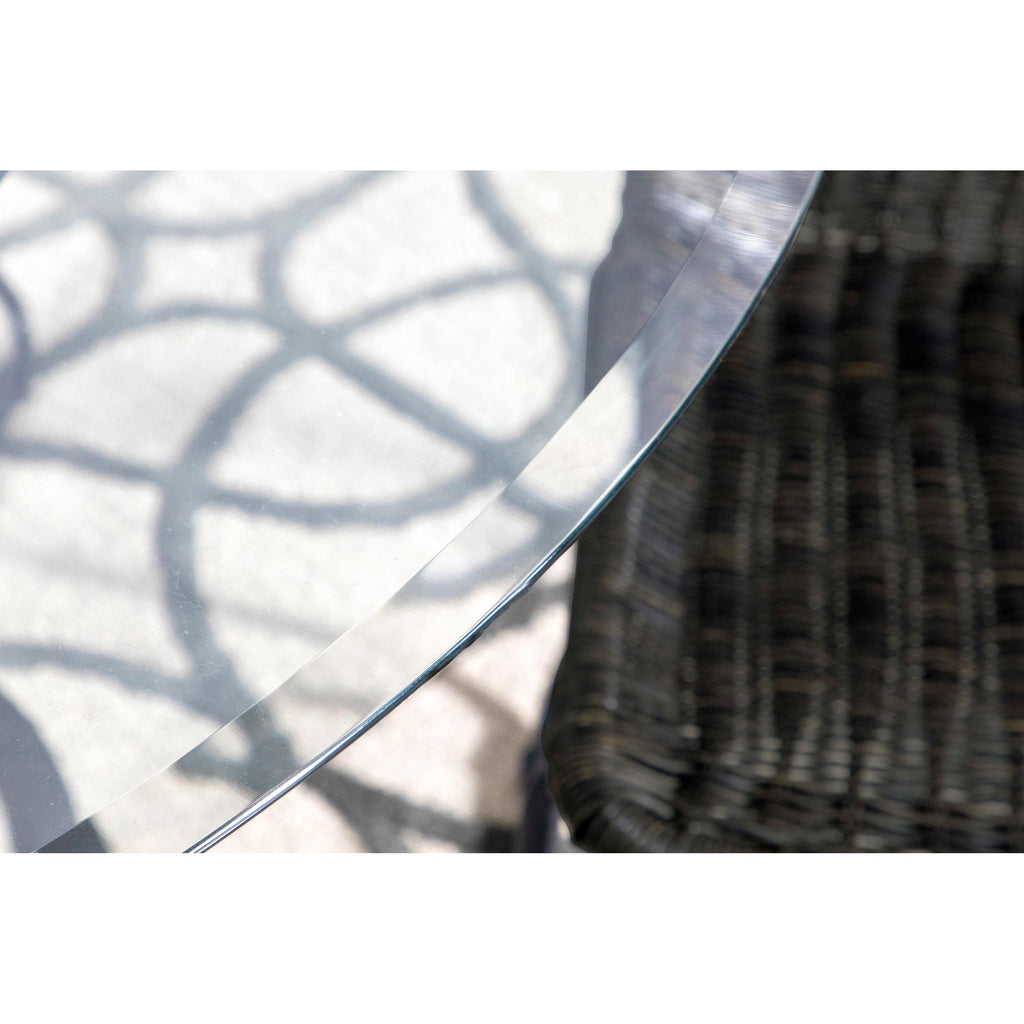 Aviano presents a contemporary dining masterpiece that's truly captivating. The meticulously crafted metal table base boasts four curvaceous legs converging around an interlocking ring waist,... Aviano presents a contemporary dining masterpiece that's truly captivating. The meticulously crafted metal table base boasts four curvaceous legs converging around an interlocking ring waist, adorned with a surprising gunmetal finish. Crowned with a 6mm 48" diameter clear tempered glass, it seamlessly blends grace and modernity. Discover the allure of the transitional glass dining table, exuding casual charm. Its clear glass round elegantly rests on a captivating base with four stylized M legs, artistically interlocked in a ring motif and adorned with a rich gunmetal finish. At 30 inches, it's the perfect addition for a chic breakfast nook or a stylish eat-in kitchen, infusing a touch of timeless elegance. View more