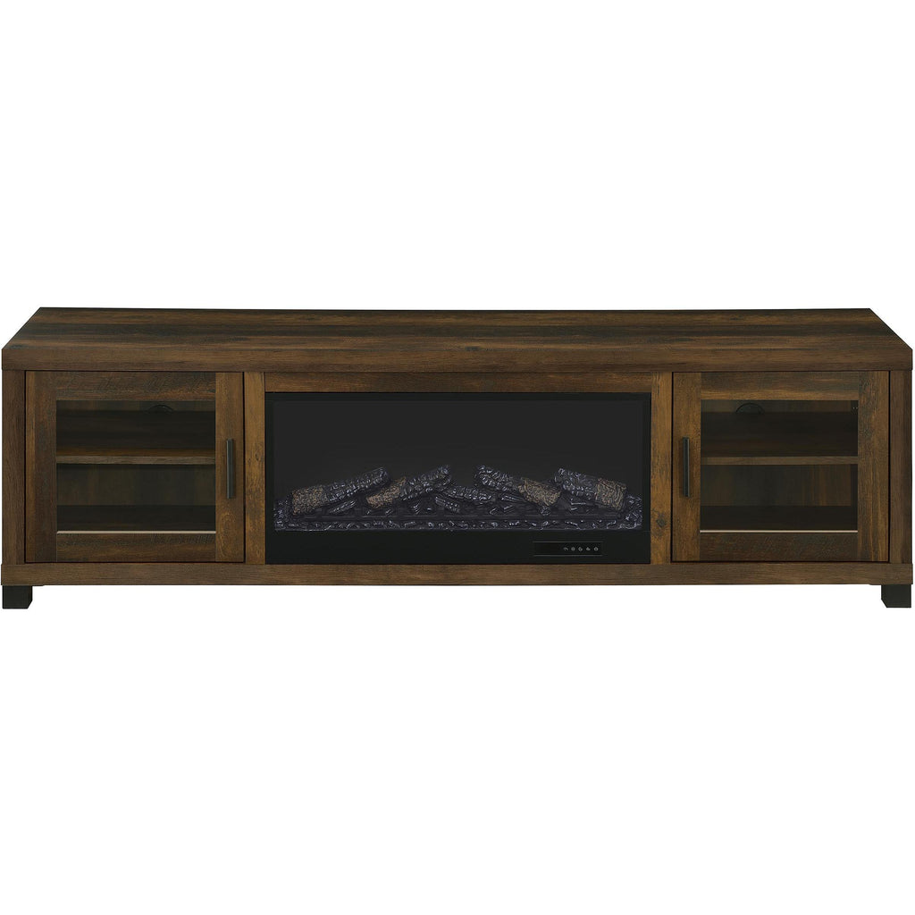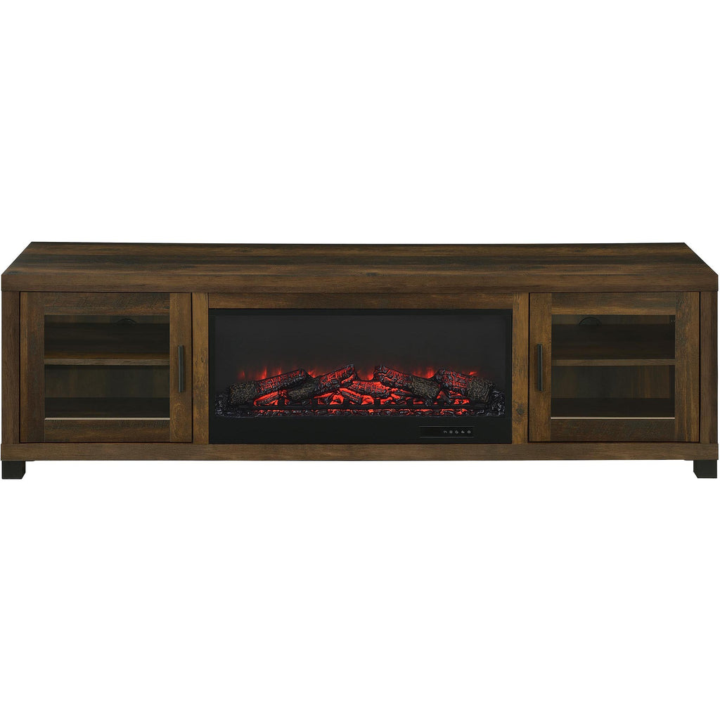 • Fireplace TV stand in dark pine finish with black hardware and contemporary linear styling
