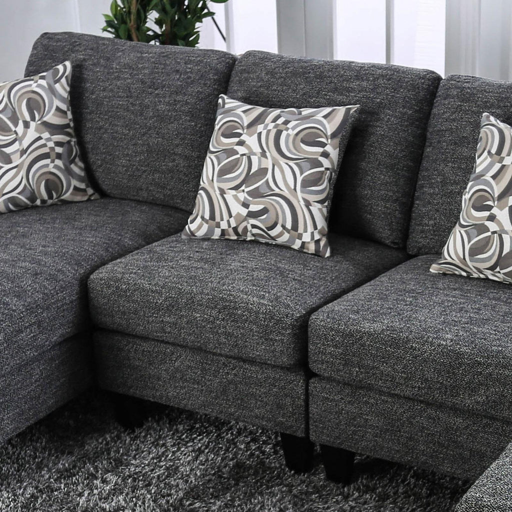 We won't blame you if you spend your days off lounging around on this sectional sofa. Its plush, it's stylish, and its customizable to however... We won't blame you if you spend your days off lounging around on this sectional sofa. Its plush, it's stylish, and its customizable to however you want to create your ultimate relaxation zone. The cool gray pattern is broken up by the accompanying patterned pillows giving the set instant decoration. View more