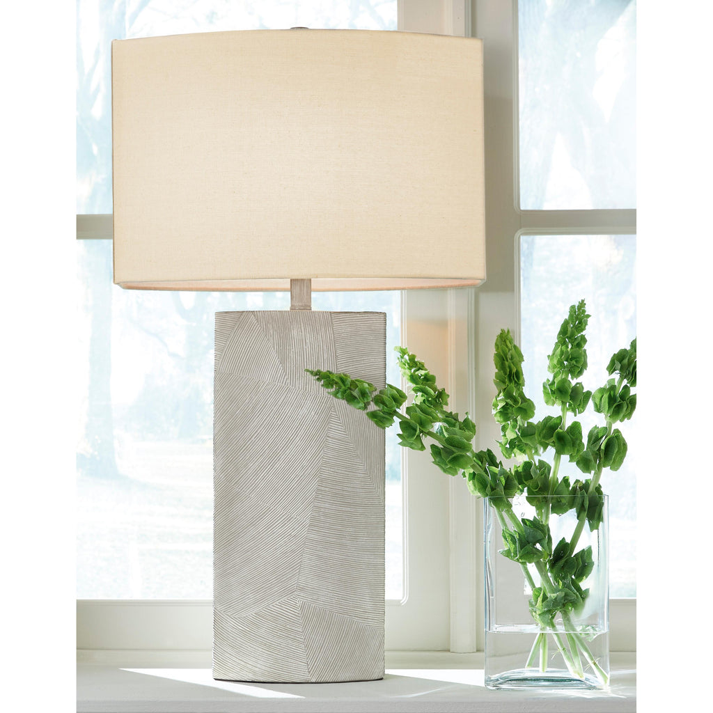 • Made of polyresin with straight-sided oval hardback fabric shade