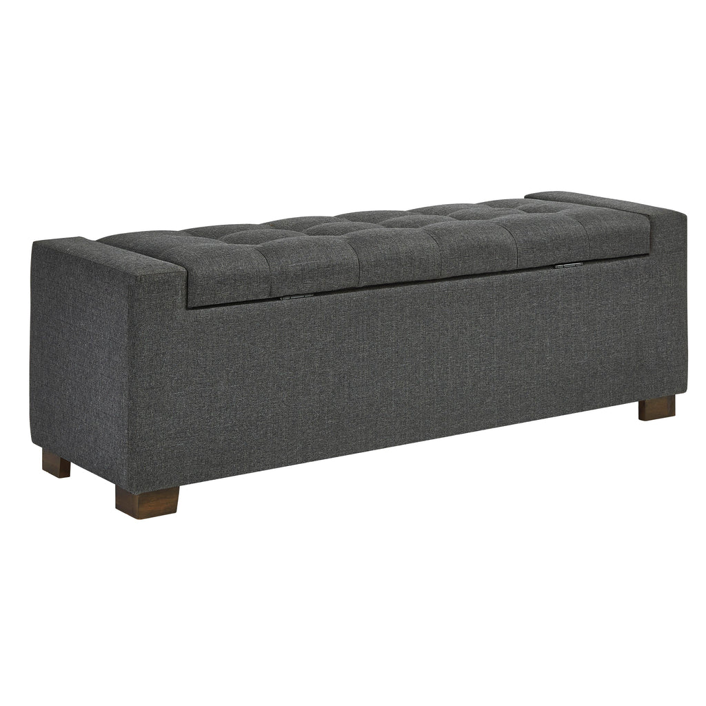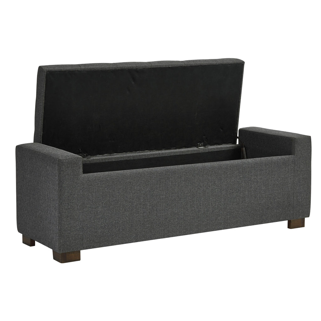Whether gracing a front entry or living room, or placed at the foot of the bed, this upholstered storage bench is loaded with flair. Tufted... Whether gracing a front entry or living room, or placed at the foot of the bed, this upholstered storage bench is loaded with flair. Tufted cushioned seat with hinge reveals an ample storage compartment for this, that and the other. Gorgeous gray fabric is the epitome of neutral sophistication. View more