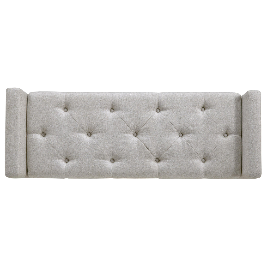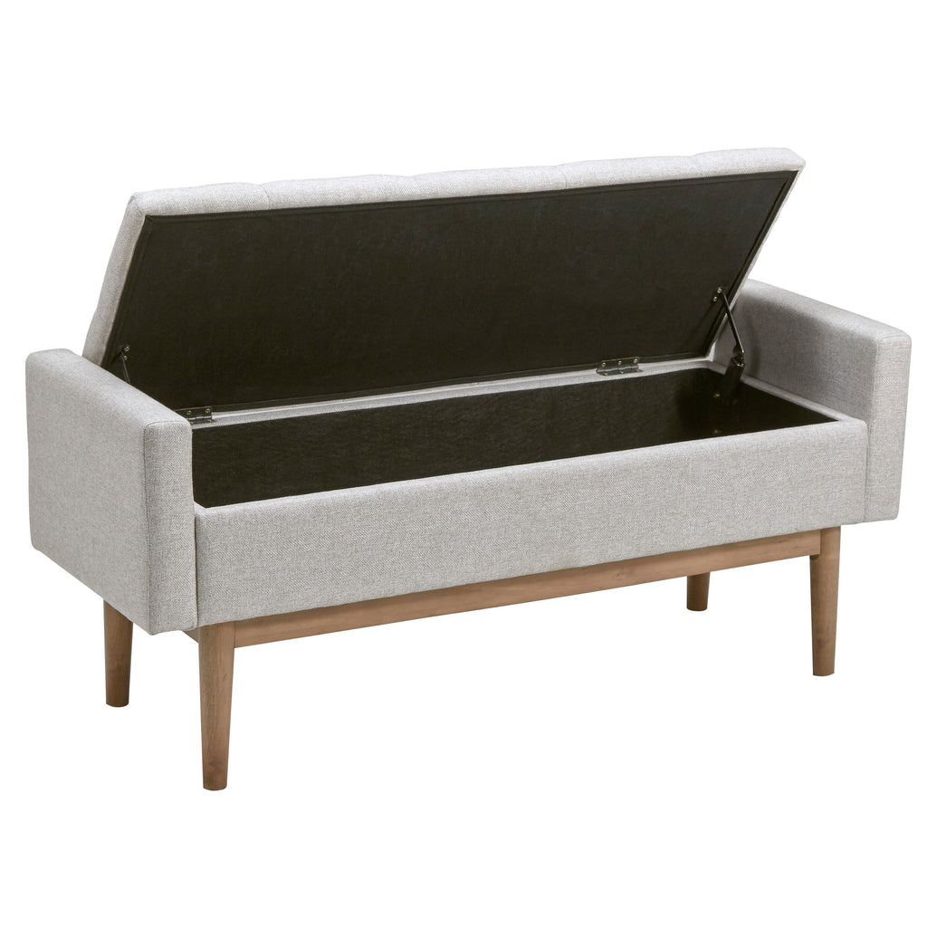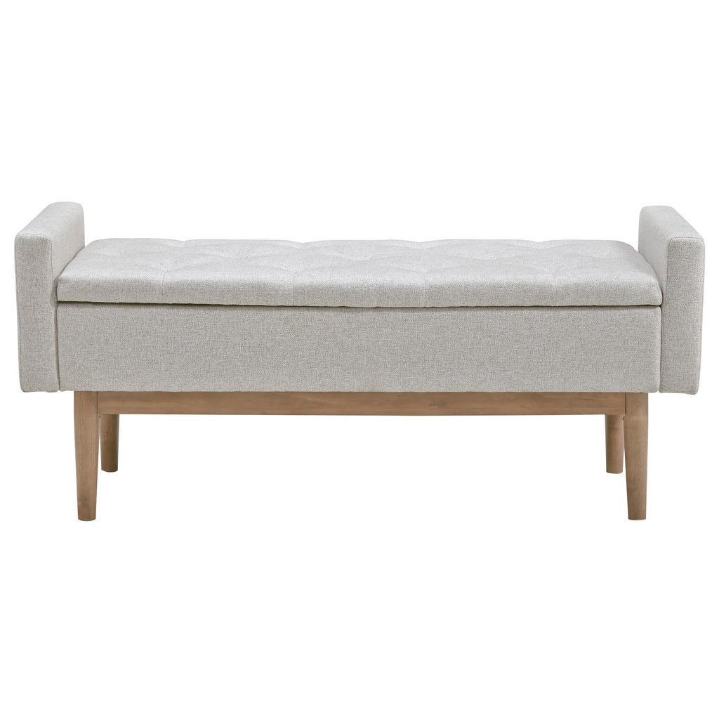 Contemporary style gets practical with this bench. The tufted beige seat cushion is hinged to allow easy access to whatever you need to hide in... Contemporary style gets practical with this bench. The tufted beige seat cushion is hinged to allow easy access to whatever you need to hide in plain sight. The raised edges give the impression of arms on this cushioned seat while the light brown finished wood legs help it blend with many different modern styles. View more