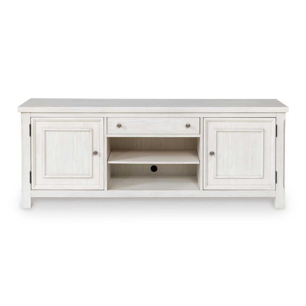 This TV stand is sure to impress when it’s time to relax after a tough day. With an antiqued white finish and wood grain texture,... This TV stand is sure to impress when it’s time to relax after a tough day. With an antiqued white finish and wood grain texture, modern farmhouse-style design has never been so fashionable. Its cabinets and adjustable shelves are ideal for keeping all your equipment well organized and displaying your treasures. And that storage drawer is perfect for smaller accessories, bringing even more function to your entertainment space. All that’s missing is you. View more