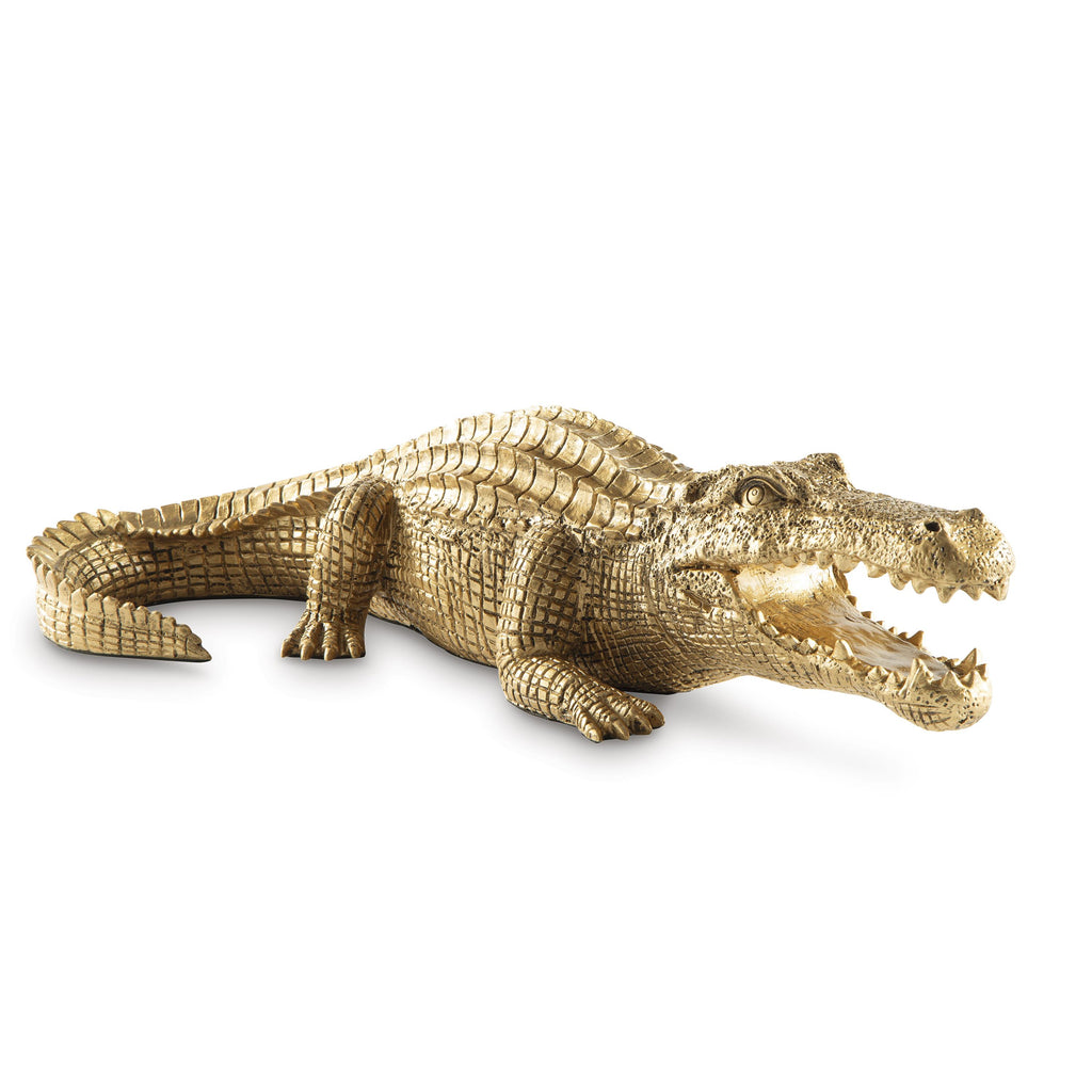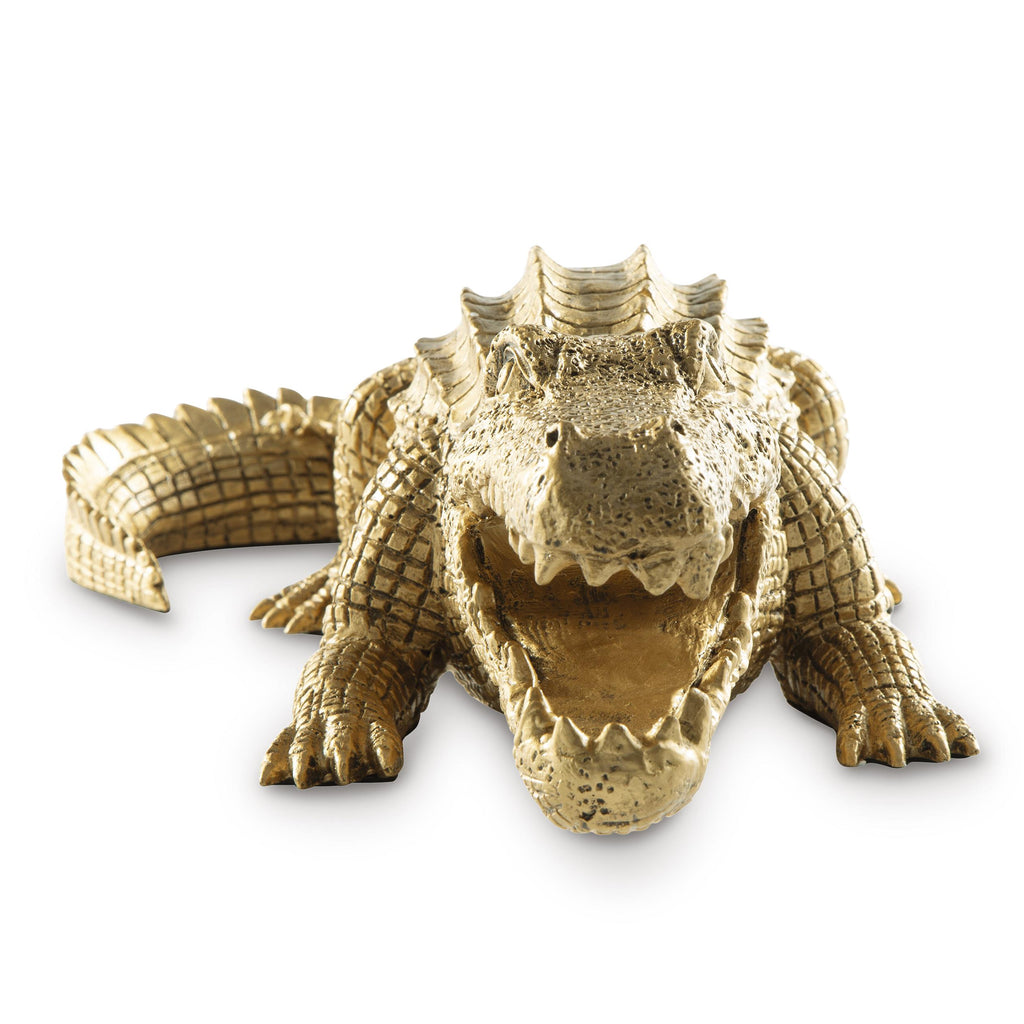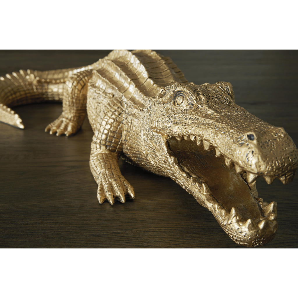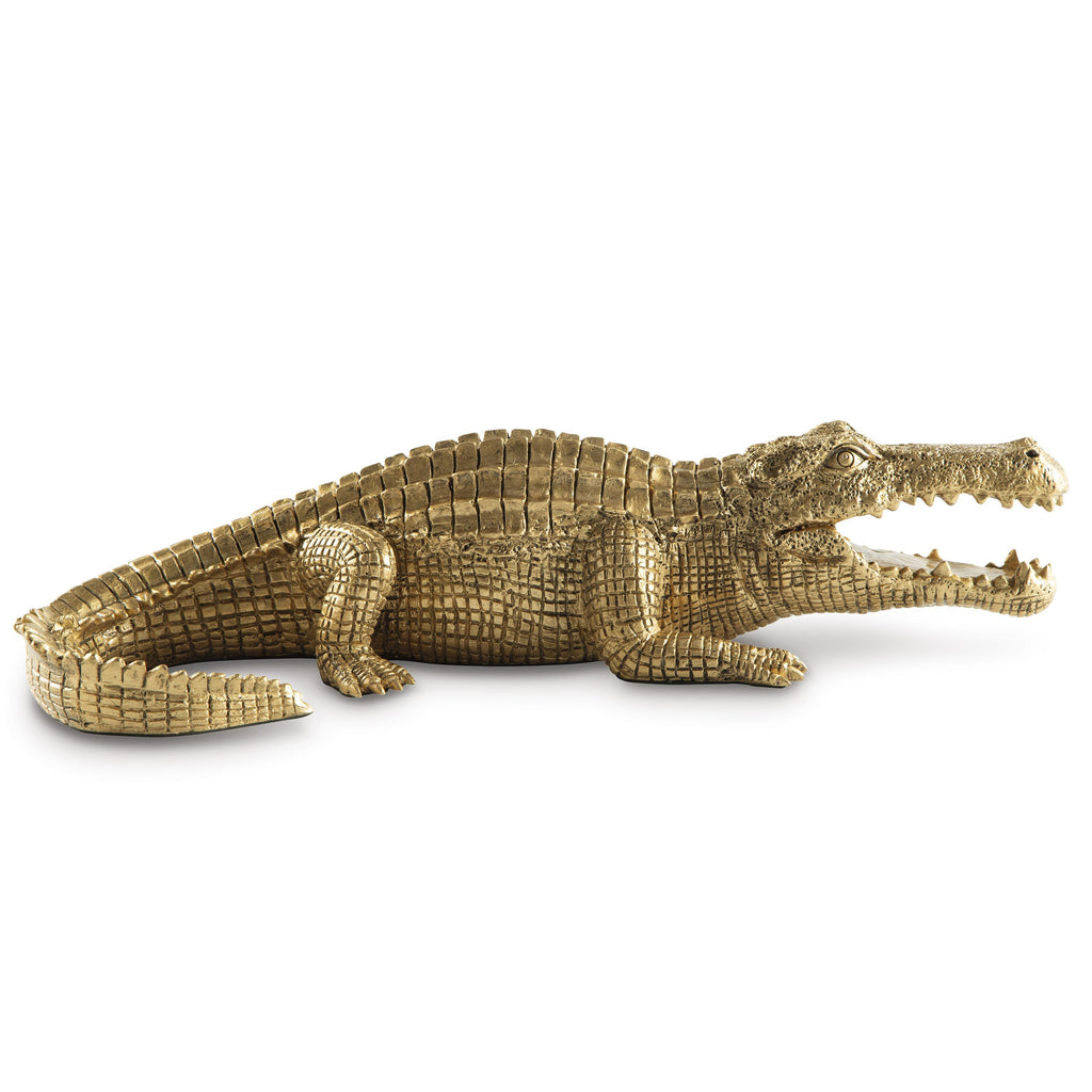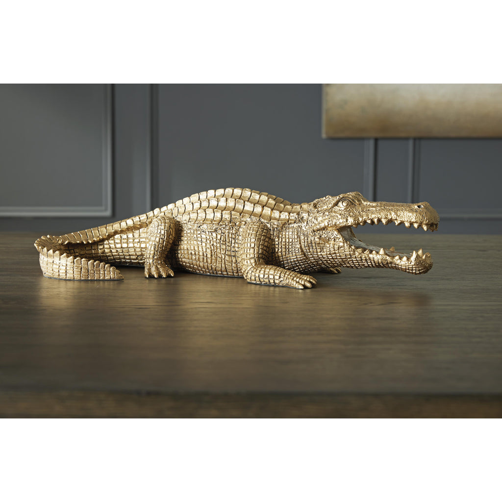 This sculpture brings a glam appeal to wild style. Luxe in an antiqued goldtone finish, the alligator-shaped art piece is a snappy addition to your... This sculpture brings a glam appeal to wild style. Luxe in an antiqued goldtone finish, the alligator-shaped art piece is a snappy addition to your office or living room decor. Its remarkable attention to detail captures the animal's likeness in decidedly contemporary fashion. View more